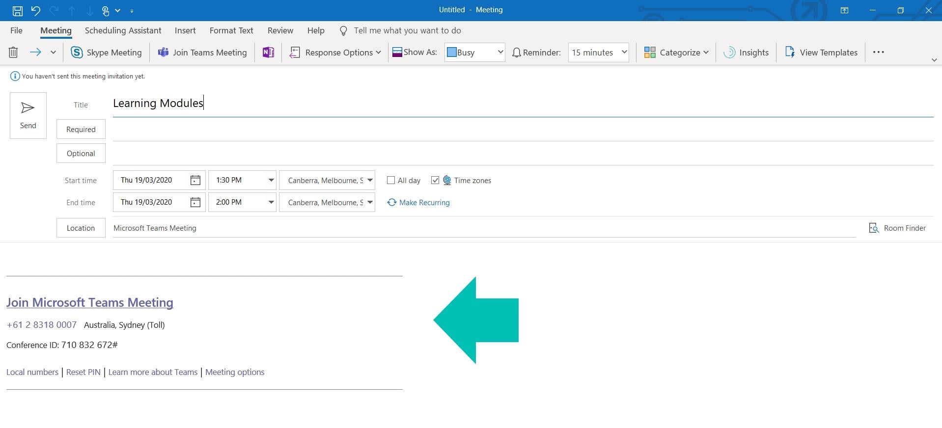 Don’t worry about inviting anyone or the date and time. You just need to get the Microsoft Teams link for the meeting so that you can copy this.