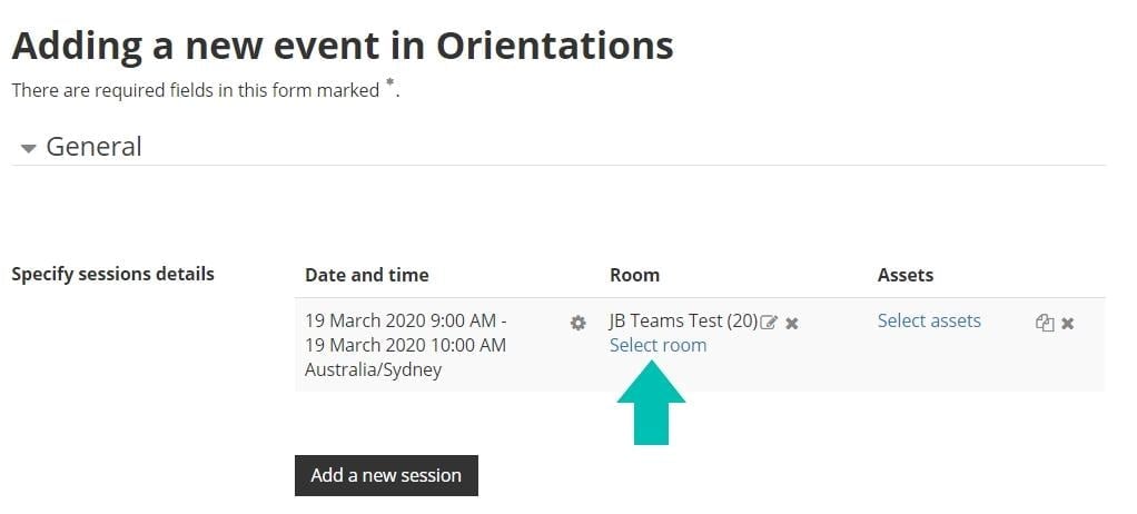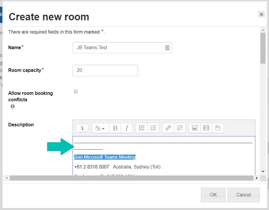 When selecting a room for a session add your joining instructions for the Teams meeting to the description. You can use a Teams meeting in exactly the same way as you use a physical room.
