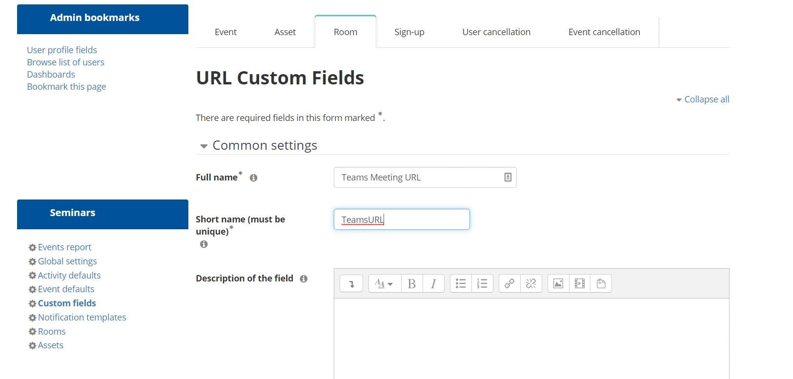 Tip – Create a Custom URL Field for the Teams URL via Site Administration -> Seminars -> Custom fields