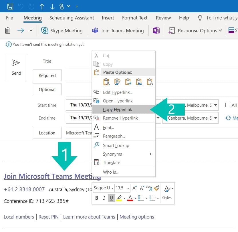 You can then add a direct link to the Teams meeting as well by copying the URL link (right-click the “Join Microsoft Teams Meeting” and choose “Copy Hyperlink” …