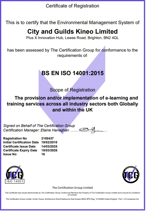 ISO14001:2015 Environmental Management System Certificate (Kineo UK)